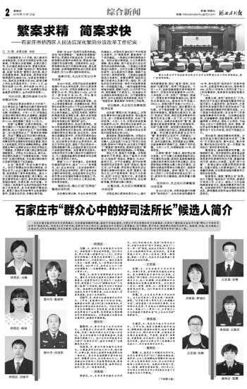 为充分展示基层司法所长爱岗敬业、无私奉献的精神风貌,推进平安省会建设,石家庄市司法局联合河北法治报社、石家庄广播电视台在全市开展“群众心中的好司法所长”推选活动。活动自6月下旬开始,采取自下而上的方式,推选出在平凡岗位上爱岗敬业、甘于奉献、勇于作为、服务群众的好司法所长。经推荐、初选,30名候选人火热出炉。《河北法治报》、河北法治网、石家庄市司法局网站等媒体同步进行公示,欢迎大家踊跃参与,为大家心中的“好司法所长”投上一票。