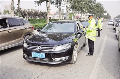 10月份,廊坊与京津同步限行机动车。限行期间,廊坊市交警二大队采取固定检查、流动巡逻相结合的方式,利用公安交通管理信息平台,对过往可疑车辆进行网上核查,严查各类违法车辆和嫌疑人,及时发现假牌、套牌等重点嫌疑车辆。图为民警正在检查过往车辆证件。 蔡峥 王志强 摄