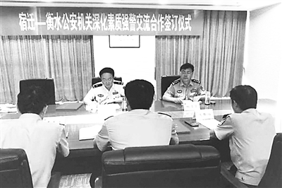 按照公安部和省公安厅关于深化素质强警交流合作的总体部署,受副市长、市公安局局长程蔚青的委托,近日,市公安局党委委员、调研员、政治部主任郭强赴江苏省宿迁市,开展考察观摩和对接工作,并与宿迁市公安局签署了《2016—2018年宿迁、衡水素质强警交流合作框架协议》。以此为标志,衡水、宿迁两地警方的警务合作工作正式全面启动。双方将围绕领导互访交流、干部挂职锻炼、教官送教上门、业务专项培训、警种部门交流、信息科技建设等6个方面,开展为期三年的素质强警交流合作。图为签约仪式现场。 杨青松 摄