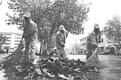 ①清扫树叶。②忙碌。