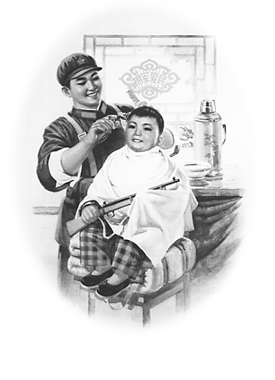 看到这幅年画,我感到很亲切很温暖,而且想起了20多年前(1991年3月11日)我写的一首小诗。那本来是为一幅摄影作品(我们部队的新闻干事拍摄的一幅解放军为少年儿童义务理发的照片)的配诗,重新读它,感觉与这幅年画也很吻合。那首题为《爱的诗行》的小诗是这样的——