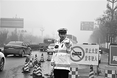 为应对连日来的恶劣天气给道路交通带来的影响,廊坊交警二大队在城乡接合处、外环公路出入口安排警力加强疏导,并组织警车实施流动管理。同时,利用手机短信、微信随时发布路况和行车安全信息,告知驾驶员选择合适道路通行。图为11月3日,民警在雾霾中疏导交通。 本报记者 田宪忠 摄