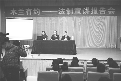 衡水市人民检察院研究室副主任刘芮等三人组成的“木兰有约”宣讲团,于日前走进衡水学院开展法治宣讲活动。宣讲团成员通过典型案例,分婚前、婚后和离婚三个阶段,讲解了妇女在婚姻家庭中所享有的财产权益及其保护问题,并对《反家庭暴力法》的相关规定进行了讲解和宣传,吸引了200余名女性教职员工及学生到场倾听。 天骄 摄