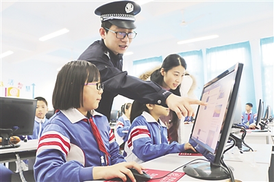 11月16日上午,广平县公安局网安大队民警深入广平小学开展“网络安全知识进校园”活动,民警通过一案一课、一事一课等形式,引导学生遵守青少年网络文明公约,自觉规范自身行为,抵制不良信息,做到文明、健康、绿色上网。图为民警指导学生健康上网。