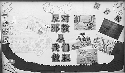 为充分调动学生们的反邪教积极性,黄骅市各中小学因地制宜,以学生为主体普遍开展了以“崇尚科学,反对邪教”为主题的签名活动和以“净化校园,远离邪教”为主题的收缴反宣品统一行动,营造了“人人争当反邪小卫士”的良好氛围;根据不同年龄段,组织开展反邪教手抄报、征文、演讲等不同内容、不同形式的比赛100余次,在经历参与中激发学生反邪教热情;另外,还发挥孩子对家庭的影响力,开展“小手拉大手”活动,通过发放《致学生家长的一封信》、《反邪教倡议书》、《反邪教明白纸》等,最大限度扩大辐射范围,营造识邪、辨邪、防邪、反邪的良好社会氛围。