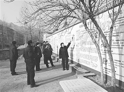 河北司法警官职业学院驻曲阳县上阁尔村工作组自2016年2月驻村扶贫以来,充分发挥法律院校的专业优势,与曲阳县司法局联合,在全县范围内开展了一系列法治宣传教育和培训活动。他们还根据村民的需要,在驻村的路边制作了一面长20米、高3米的法治文化墙,以图文并茂的形式向乡亲们宣讲了婚姻法、老年人权益保障法、预防未成年人犯罪、打击非法集资、预防电信诈骗等法律知识。乡亲们只要路过,就会驻足观看法治文化墙的内容。图为工作组队员在法治文化墙前给乡亲们宣讲法律知识,解答乡亲们提出的法律问题。 张平 摄
