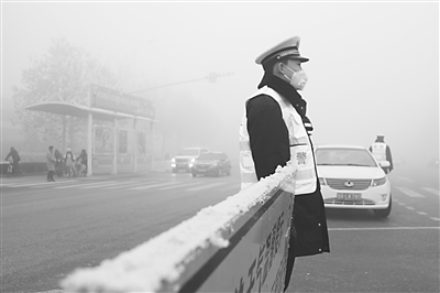 “冬季会战”行动中,交警雾霾中保畅通