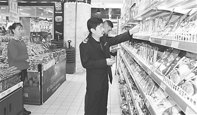 为确保春节期间的食品药品安全,定州市食药监部门组织执法人员对食品市场开展节前安全检查。执法人员对商品的进货渠道、台账,食品从业人员有无健康证,有无过期食品,包装食品标识是否完整,特殊食品储存方式是否正确,肉类食品检疫情况是否合格等进行了逐一核查。同时,针对春节期间群众消费需求量大的腌腊肉制品、香肠调料、速冻食品及炒货、饮料、糖果糕点等进行抽样检查。图为执法人员在超市对食品进行检查。