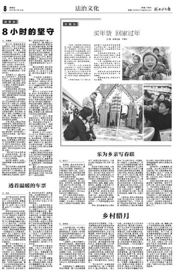 年越来越近了,隆重的新年即拉开帷幕。整个村庄都被裹进浓浓的节日氛围里。于是一切都围绕过新年而紧张有序地进行,到处涌动着“年”的味道。外出打工的姑娘小伙鸟儿归巢般陆陆续续回到家中,大包小包满载着一年艰辛的收获,踏上日夜思念的故土,到家了,父母喜滋滋地接过孩子们从外地带回的年货,爱不释手的数落孩子不该乱花钱。腊月就像母亲守着的灶台,温暖滋润着儿女们的心,腊月就像母亲纳鞋底的线,有着永远割舍不断的亲情,无论你飞的多远,脚下的那根线,永远连着你回家的路,扯着你回家的情。回家过年就像一只号角,总能唤醒游子心底的惦念与沉思,让远在天涯各处的游子,升腾起一种执着的信念,回家过年。