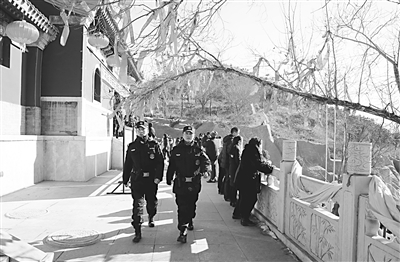 春节期间,滦县公安局巡特警大队根据当地民俗活动规律及文化活动安排,合理调配警力,加大巡逻防控力度,确保人民群众度过一个平安、祥和的节日。图为2月1日巡特警队员在滦州古城大觉寺巡逻执勤的情景。 刘振远 摄