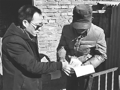 2月26日上午,元氏县人民法院干警利用周末时间,来到该县北正乡鹿台村,将全院干警自发捐助的几千元资助款和部分书籍、衣物送到贫困学生时某家中。这是该院把扶贫工作作为践行司法为民、提升司法公信力的一次具体行动。图为干警将资助款交到时某家长的手中。