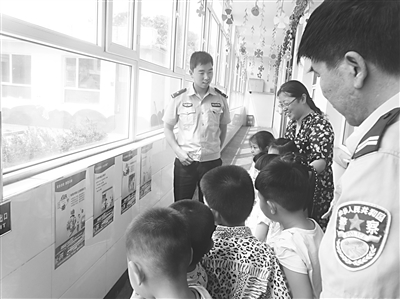 日前,石家庄市公安局矿区分局凤山派出所民警走进辖区幼儿园,开展了丰富多彩的消防宣传活动。为了让幼儿园的小朋友们听得懂、记得住,民警们首先发放了具有卡通色彩的学校防火、家庭防火等消防宣传单。随后,消防人员通过生动的语言,深入浅出地向孩子们讲解了火灾的危害、常见的消防安全标志、消防安全器材以及正确的火场逃生方式。图为民警在结合宣传彩页给孩子们讲解火灾中的逃生自救知识。