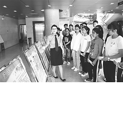 6月29日,廊坊市广阳区人民检察院联合尖塔中学举办了一场别开生面的模拟法庭。该院未检科干警为参加模拟法庭的学生们讲解了庭审知识和庭审规范,对参与模拟法庭的学生们全程指导并进行多次演练。为更好地向学生们进行法治宣教,模拟法庭开始前,未检科干警向学生们发放了《未检工作宣传手册》,组织他们参观了未成年人刑事检察工作展牌,详细向学生们介绍了未成年人犯罪的法律规定、有关案例和预防措施。图为学生们参观未成年人刑事检察工作展牌。 本报记者 田宪忠 摄