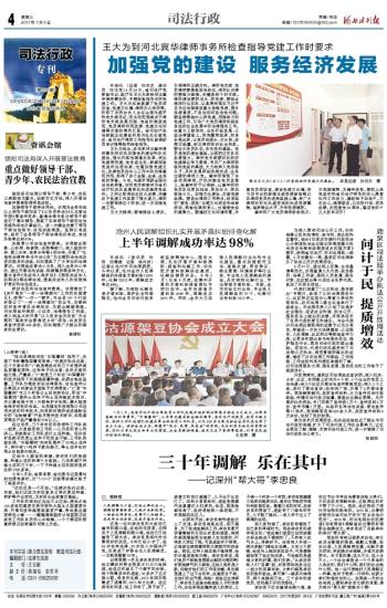 本报讯 (记者 张世杰 通讯员 张汉军)6月28日,省司法厅党委副书记、副厅长王大为来到河北冀华律师事务所,专题检查指导该所党建工作。王大为实地察看了党员活动室、党建文化墙、律师办公场所等,听取了该所合伙人会议主席马越平和党支部书记、所主任范浩南关于律所党支部发展历程、党组织制度规范、党员律师作用发挥、党建文化环境等方面的情况汇报。省司法厅政治部副主任兼组织培训处处长曾宪成、省司法厅律师工作指导处副调研员李占强等陪同检查指导。