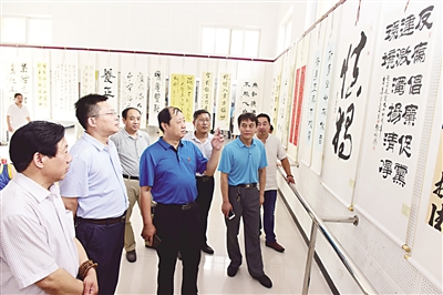 为喜迎党的十九大召开,新乐市纪委、新乐市委宣传部等单位联合举办了“颂党恩、倡廉政、扬正气”书画展。他们邀请新乐市及周边县(市)区的书画家及书画爱好者创作了200多幅廉政题材的书画作品,在该市文化馆展出,以此给全市党员干部及群众上生动的廉政文化教育课。图为7月4日新乐市部分党员干部正在观看书画展。 贾敏杰 摄