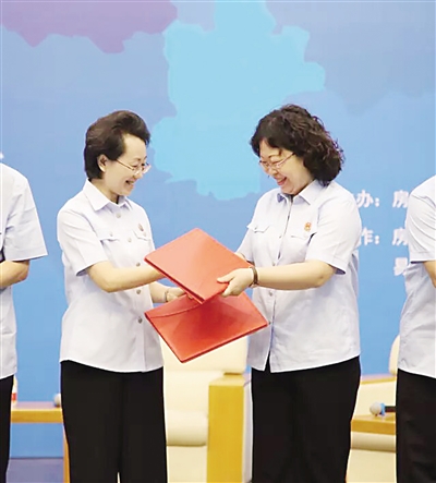 图为张家口中院院长王靖(右)与北京房山区法院院长邵明艳交换签约协议书。本报记者 梁燕 摄