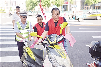 为树立群众“文明交通从我做起”的意识,承德县大力开展 “告别不文明交通行为,创建文明城市——志愿者在行动”活动。文明交通志愿者随执勤民警劝导纠正行人、非机动车闯红灯、不走斑马线、占道停车、车窗抛物等不文明交通行为,用热情的服务提醒、引导车辆和行人文明出行。图为日前志愿者在协助执勤民警处理违停电动车。 闫国辉 摄