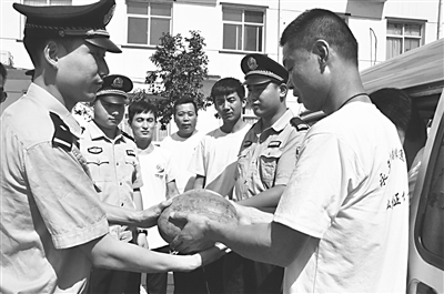 7月11日,邯郸市永年区爱心人士代表到永年区公安局巡警大队及路面一线执勤岗点,为高温酷暑中巡逻执勤的民警送来西瓜,给炎炎夏日带来一丝清凉,再现浓浓警民鱼水情。 胡小闯 摄