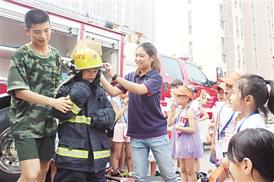 “接到火警电话,消防员必须一分钟内穿好衣服,登上消防车……”孩子们一个个瞪大眼睛,认真听消防战士讲解。7月20日上午,石家庄市裕华区2017年度未成年人暑期消防夏令营开营。活动中,消防战士带领孩子们试穿消防服、铺设连接水带、架设水枪灭火……孩子们在玩中学、在学中体会避险技巧,过足了“消防瘾”。 本报记者 鲍娜军 摄
