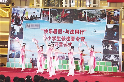本届夏令营共有4192名中小学生报名参加海选,通过法律知识答题、才艺展示测试,最终确定了300名小营员参加本届夏令营的八项主题活动。图为中小学生普法夏令营开营仪式演出现场。路珊珊 摄