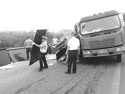 7月27日下午3时许,在石太高速转青银高速拐弯处,一辆拉木板的货车因驾驶不当发生侧翻,随车货物散落一地,导致交通严重拥堵。河北高速交警铜冶大队民警邢海涛接警后,迅速出警赶到现场疏导交通。图为民警在帮助车主搬运货物。 本报记者