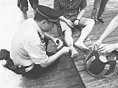 7月8日10时40分,执勤民警葛建智、庞勃等人巡逻到东山旅游码头时,接到群众紧急求助:哈尔滨游客李先生游玩时不慎被礁石划伤了脚,伤口较深,血流不止。葛建智、庞勃找来急救箱,先用脱脂棉球沾酒精擦拭,再用碘酒消毒,纱布止血,绷带包扎,同时联系车辆将游客送到医院进一步处理。看到民警们专业、镇定的处置工作,李先生家属夸奖说:“关键时刻,还得靠警察。”