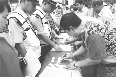 8月3日,武安市交警大队民警会同市文明办、红十字会志愿者开展了“开展文明交通行,创建省级文明城”千人签名活动。民警倡议广大行人和非机动车能够各行其道,机动车驾驶员能够遵守交通法规,文明出行,在斑马线前礼让行人。过往市民纷纷在条幅上签名,表示愿意为创城工作做出贡献。图为签名现场。