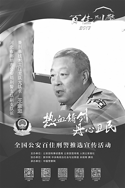 王金忠,现任廊坊市公安局刑事警察支队副支队长兼刑事技术工作大队大队长。王金忠坚持刑事技术是第一破案力的理念,在侦破大要案件中发挥了重要作用。