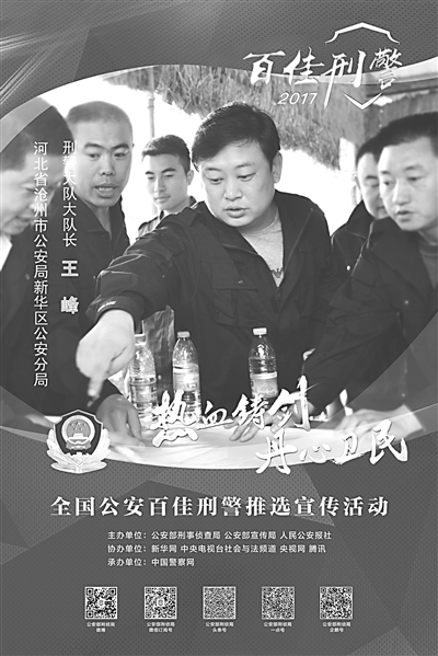 王峰,沧州市公安局新华区公安分局刑警大队大队长,从警17年侦破无数大案要案。王峰始终牢记并努力实践全心全意为人民服务的宗旨,恪尽职守、爱岗敬业,顽强拼搏、无私奉献,在平凡的岗位上做出了不平凡的业绩。自参加工作以来先后担任探长、重案中队长,责任区中队长,刑警大队教导员、大队长等职务。王峰以扎实的工作态度全心全意投入到为人民服务中去,在自己酷爱的刑侦岗位上,努力做一名让党放心、让群众满意的优秀人民警察。