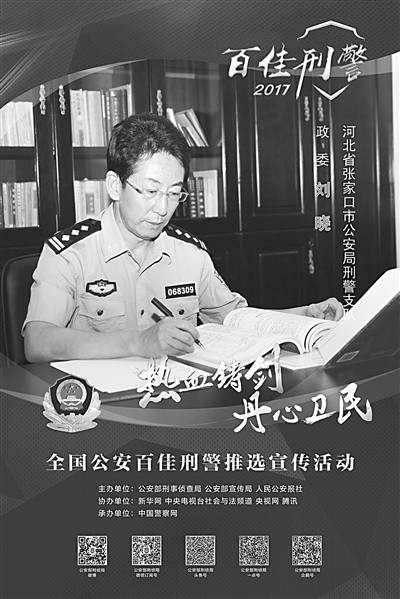 刘晓,张家口市公安局刑警支队政委。作为法医,他善用技术破解悬疑,打开侦查中的一个个问号,让现场上的痕迹物证开口讲话,使一件件悬疑案件起死回生。他反向思维,为秉公执法反遭诬告的民警洗脱了冤屈;用DNA技术智破康保县强奸案,开了张家口市零口供判决之先河;破获了轰动全国的“3·09”蔚县南安寺塔地宫特大文物被盗案和震惊全省的历时9年的蔚县特大系列抢劫强奸杀人案件……他是难得的法医全才,谙熟法医各专业理论与检验鉴定技术,出具鉴定文书6000余份,准确率100%,为服务侦查、打击犯罪、维护社会治安稳定做出了突出贡献。