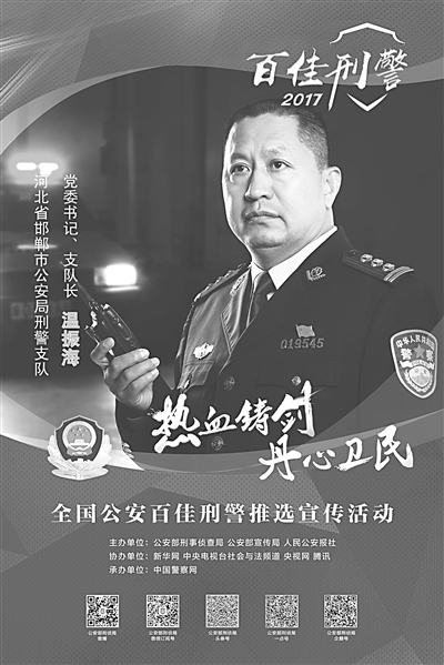 温振海,邯郸市公安局刑警支队党委书记、支队长。从警33年,温振海始终奋战在刑侦一线,逐步成长为“行家里手”。他追捕亡命徒,负伤前行,拔枪击中嫌犯。那声枪响,铭记着青葱岁月。他千里奔袭、孤身擒贼,他与形形色色的犯罪分子进行殊死较量,屡立战功。33年来,他指挥参与侦破500余起重、特大刑事和经济犯罪案件,其中很多都是公安部督办案件。33年来,他一身铁血迎风立,一片丹心向朝阳,即便明知有危险甚至流血,仍正气凛然向前冲,维护法律尊严,回应人民心声。