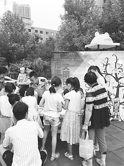 河北交警艺术团为群众献上了一场场精彩纷呈的艺术大餐,现场教授交通手势操、有奖问答、游戏互动……内容丰富、形式新颖的活动在演出现场掀起了一个又一个的高潮。观众在树干样式的签名板上签名、书写寄语,承诺“共建文明城从我做起”,用手中的画笔为文明之树增枝添叶,将其装点成象征文明的参天大树,最终汇聚成一片希望森林,为城市添彩。