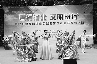 清爽的歌声,送走了炎炎夏日;温馨的祝福,迎来了飒飒秋凉。河北交警艺术团公益宣传巡回演出进社区活动,以展现文明交通、文明城市为主题,从盛夏将一直持续到仲秋。 本次活动由省文明办、省公安交管局、石家庄市公安交管局联合主办,于7月至9月在石家庄市各大社区举行。