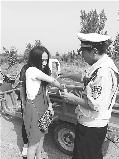 8月20日上午,怀来县交警大队东花园中队民警在巡逻至九街路段时,发现两名女子骑三轮电动车侧翻,二人均受轻伤。中队长孙鹏翔见状,连忙取出警车上的医药箱,为二人上药包扎。