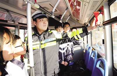 “同学们,这是逃生锤,是在车辆发生紧急情况时用来敲开车内应急出口玻璃的。”1月3日下午,沧州市公安交警二大队组织30多名中学生来到公交公司,开展“我与安全零距离”体验活动。交警为学生们讲解了交通安全知识,并组织他们进行了自救演练。图为学生们学习逃生锤的使用方法。 孙明山 摄