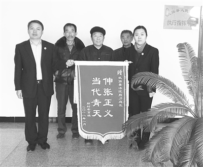188名农民工兄弟拿到了属于自己的血汗钱,农民工代表手持“伸张正义,当代青天”的锦旗,交到武强法院这些“讨薪法官”的手中。