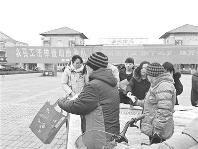 为维护农民工合法权益,防止拖欠农民工工资现象的发生,1月4日上午,冀州区司法局联合区总工会,带领资深律师走进迎宾市场,就农民工申请法律援助及工资待遇等问题开展了专项政策宣传,双冀律师事务所的两名律师现场为群众答疑解惑。此次活动共发放宣传资料1000余份,为7名农民工解答了有关拖欠劳动报酬的问题,解答其他咨询10余件。 梁旭霞 摄