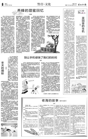 四叔当过空降兵,胆子大。我那时刚上二年级,对蜜蜂的好奇心也使我渐渐放下恐惧。一放学,四叔就喊我过去,跟他学养蜂。母亲怕我被蜜蜂蜇着,反对我去,父亲却说有他四叔呢,怕什么?四叔说男孩子从小练胆子学本事,长大后有好处。就这样,我有空就跟着四叔学养蜜蜂。