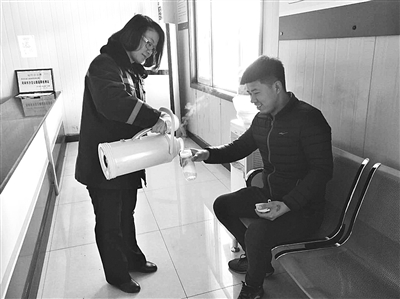 自春节假期以来,河间路政工作人员文明执法、热情服务,他们在路政车辆上常备拖车绳、车辆维修工具等物资,及时为受困司乘人员提供力所能及的帮助。图为路政工作人员给车子抛锚的司机倒热水。 吕万田 摄
