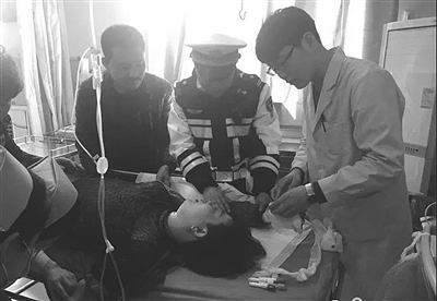 2月23日上午10时许,石家庄市公安局交通管理局环城交警大队裕华东警务站主任王燕东、辅警鲍亚强在站外执勤时,一辆黑色轿车停到警务站旁,一中年男子下车后焦急地向民警求助。男子称其爱人干活时手臂被机器碾压,急需到省三院救治,因路况不熟,害怕因拥堵错过最佳抢救时机,希望民警帮忙护送。民警随即驾驶警车引领伤者车辆迅速向医院驶去,沿途拉响警报,喊话请求其他车辆避让。不到10分钟,警车就将求助车辆引入省三院,使伤者第一时间得到救治。图为民警协助将伤者送入医院救治。