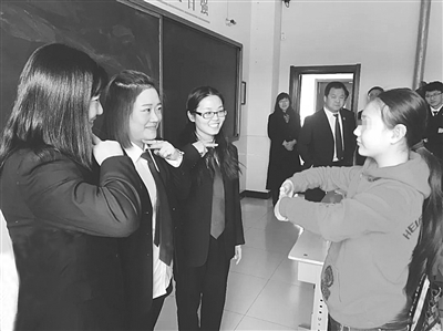 河间市检察院于学雷锋纪念日当天组织该院11名干警组成学雷锋志愿者服务队,到特教学校看望那里的学生。其间,他们详细询问了孩子们的身体、学习情况,并送上书包等学习用品。图为检察人员在与学生进行手语交流。 张铁路 田蕊