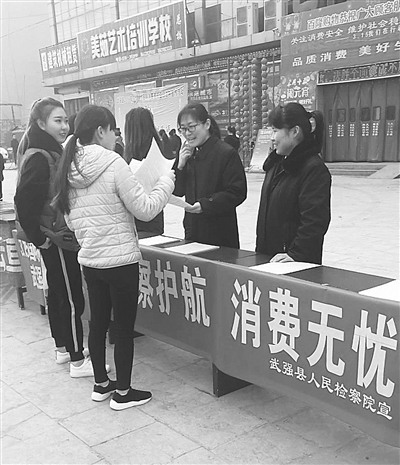 近日,武强县人民检察院干警在该县某商场门前开展了以“检察护航 消费无忧”为主题的法治宣传活动。该院公诉部干警走上街头,设立法治宣传服务台,向广大群众宣传消费者权益保护法的相关知识,解答群众的法律疑问和在维权中遇到的实际问题。此次活动共发放法律宣传资料500余份,解答法律咨询50余人次,有效地提高了群众的维权意识和法律意识,进一步加强了检察监督职能,取得了良好的法律宣传效果。 张浩威 摄