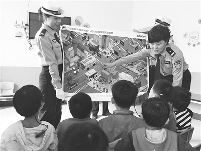 下午2时,张敏和队员们带着彩笔、玩具和图书准时来到学校。她们根据孩子的特点,讲解了简单的交通安全常识,并通过4D“AR增强现实全景图”让孩子们在有趣的游戏中掌握交通规则。“减速慢行信号开始,一、二、三、四……”女警们还和孩子们一起练习交通警察指挥手势,互动表演节目,一起做游戏,给孩子们讲故事。一个半小时的快乐时光在孩子们开心的笑声中很快流逝。