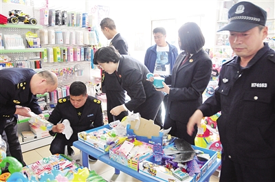 日前,怀来县检察院联合该县食品和市场监督管理局、公安局,对全县各中小学周边商店、批发部进行逐户专项清查,查获并扣押“史莱姆”水晶泥、沙皮胶泥等产品800余件。图为工作人员对查获的“史莱姆”水晶泥等问题产品进行封存扣押。