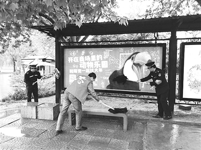 4月22日9时,石家庄市新华区“建设文明新华 党员干部在行动”志愿服务活动启动仪式在水上公园举行。此次活动旨在全力推进志愿服务活动制度化、常态化,发挥党员干部在志愿服务中的模范作用。图为城管局党员干部志愿者在水上公园擦拭座椅和宣传橱窗。