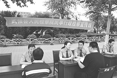武强县检察院在衡水市检察院的指导下,日前组织干警进机关,入社区,去农村,到企业,开展普法宣传教育活动,耐心解答群众最关切的法律问题,并收集案件线索,加大检察公益诉讼办案力度,扩大民事行政检察工作的社会认知度。图为衡水市检察院党组成员、副检察长李再兴与武强县检察院党组书记、检察长刘晓燕带领干警到社区开展民行检察宣传活动。 刘金英 刘誉盛 摄