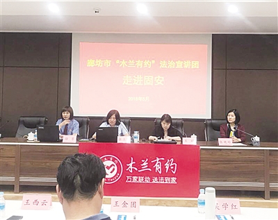 固安县检察院女检察官徐芳近日同固安县法院女法官张立华、河北环京律师事务所女律师王娟,组成廊坊市“木兰有约”法治宣讲团,走进固安县市民服务中心,围绕“民法与我们的生活”这一主题,向120余位中小学教师、供电局干部和审批中心工作人员进行了法律宣讲,并与大家互动交流,详细解答了大家关心的法律问题。固安县妇联主席张艳玲主持宣讲活动。
