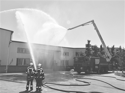 6月27日上午,廊坊市广阳区安监局、消防大队联合组织大型消防灭火和疏散演练,100余家社会单位负责人参加了此次演练。演练假设一家石化公司仓库突发火灾,该公司立即启动应急预案,疏散人员,组织初起火灾扑救,同时,按照“联查联演联战”的工作原则,北旺乡微型消防站、东环路消防中队、新华路消防中队陆续到现场进行处置。演练活动紧张有序,各单位密切配合,达到了预期效果。图为演练现场。 本报记者 田宪忠 摄