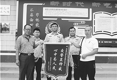 近日,在308国道南宫市南王庄村口发生一起交通事故,一辆电动三轮车被撞倒,三轮车驾驶人王某受重伤,肇事车辆当场逃逸。南宫市交警大队民警通过大范围的细致排查,在两天时间内便将肇事逃逸嫌疑人抓获。伤者王某的家人随后专程到该大队,将一面锦旗送到追逃民警手中,表达深深的谢意。 李栋 王桂英 摄