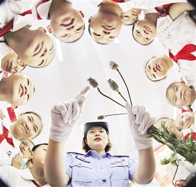 6月25日上午,秦皇岛市公安局禁毒支队民警走进海港区临河里小学,用通俗易懂的语言,给学生们讲解了毒品的定义、种类、特征等相关知识,给同学们上了一堂生动深刻的普及禁毒基本知识的宣传课,并结合相关案例,给同学们讲述了毒品对个人、家庭、社会造成的严重危害及防范毒品侵害的方式方法,告诫同学们要增强自我防护意识,自觉远离毒品,从思想上、行为上构筑起拒绝毒品的牢固防线。图为民警向小学生介绍如何辨识毒品。